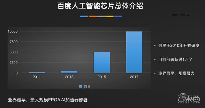 百度是业界最早、规模最大用FPGA来做AI架构的公司,最早在2010年就开始研发,2011年开展小规模部署上线,2015年打破几千片的部署规模,2017年部署超过了10000片FPGA,百度内部数据中心、自动驾驶系统等都在大规模使用。