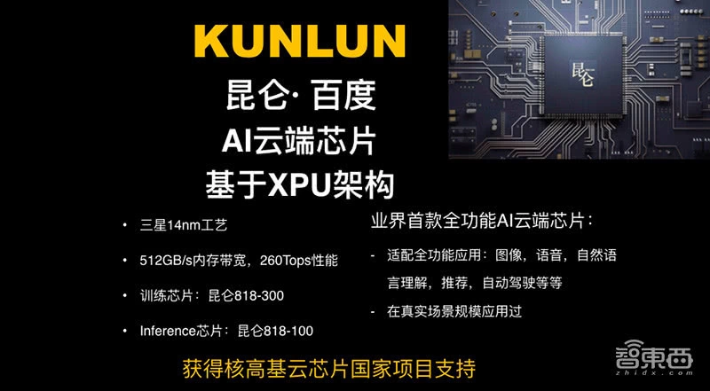 “昆仑”芯片是三星14m工艺的芯片,有很高的内存带宽,达到了260tops性能,这个芯片是非常通用非常灵活的,芯片既可以做训练也可以做推理。这是全功能的AI芯片,因为XPU的功能架构真正在内部很多应用里都得到验证,在线上部署过,包括图像、语音、自然语言处理、自动驾驶、推荐等,我们有信心说这是比较全功能的架构。