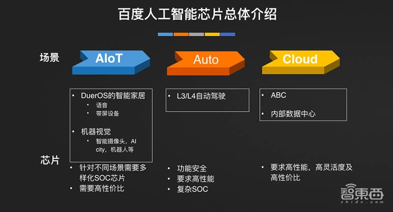 跟大家分享一下人工智能芯片的介绍,去年百度在开发者大会上分享了“昆仑”芯片,但实际上百度在过去7、8年时间里已经做了很多AI架构的积累。百度有很多场景,包括AIoT、自动驾驶、智能云,在这样的场景下对芯片的需求是不一样的。AIoT场景要求非常低功耗、场景分散零碎、芯片需要性价比高;汽车场景要求安全、高性能、复杂SoC;云要求非常高性能以及高灵活度、高性价比。这是做普适AI芯片架构需要面临非常大的挑战。