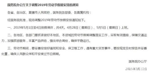 假期对于已经工作上班的人来说,是非常珍贵的时间,这段时间休息一下,放松一下真的是非常让人开心的!往年五一假期为三天,很多人都选择在家呆着,不过今天我们迎来了非常令人振奋的消息,五一将放四天假!根据国务院办公厅发布的通知来看2019年5月1日至4日放假调休,各位赶紧安排好自己的五一小长假吧!