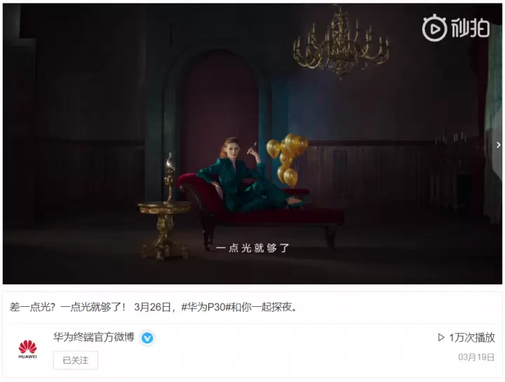 第一支预热视频,强调了华为P30将实现对暗光环境更强的适应能力,这意味着华为P30将在传感器上有增进感光度的技术,或是拥有更大的镜头光圈。虽然尚且没有官方话术,但这绝对是微光级暗拍的极限。