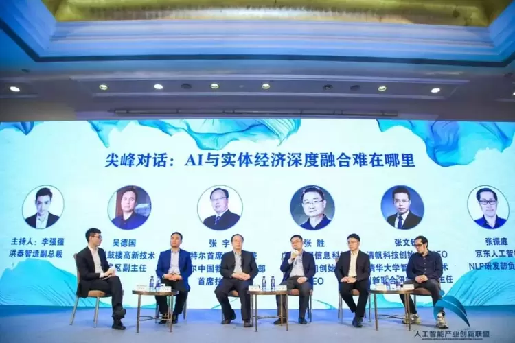 大会的最后,在洪泰智造副总裁李强强的主持下,徐州鼓楼高新技术开发区副主任吴德国、英特尔首席工程师兼英特尔中国物联网事业部首席技术官张宇、广州灵聚信息科技有限公司创始人兼CEO张胜、清帆科技创始人兼CEO张文铸、京东人工智能NLP研发部负责人张振庭等5位嘉宾,围绕“AI与实体经济深度融合难在哪里”这一主题,展开了精彩的尖峰对话,就人工智能的创新发展和应用落地等话题展开深入交流。