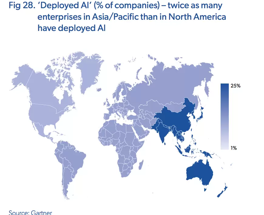 上述报告显示,亚太地区采用AI技术企业的数量是北美地区公司的两倍。其中,中国公司引领亚太AI,北京、上海、广东以及浙江和江苏是主要的聚集地。
