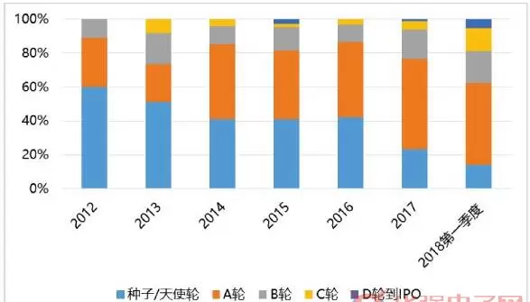 人工智能投资轮次向中后期转移。随着人工智能市场板块的逐渐成熟,种子轮/天使轮投资占比逐渐降低,说明资本更愿意投资有团队技术有积累、有应用落地场景、市场开拓能力的项目,这也预示着人工智能领域的项目成长在逐渐加速。