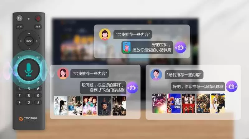 一直以来,智能手机、智能音箱都是人工智能应用的主角,此次广东广电全新发布的AI电视助手2.0则着力想让更多人感受到:A.I.+广电也可以让大家以更自然、更轻松的方式畅享生活乐趣。比如,可以实现“通过声音猜你喜欢”:在家里,也许爸爸喜欢看球赛,妈妈喜欢看电视剧,孩子喜欢看动画片。但传统电视很难根据不同的用户做内容区分。AI电视助手2.0通过对用户年龄、性别的声纹识别,能够准确判断家庭成员角色,再结合大数据和用户搜索习惯,基于用户画像与内容的个性化推荐协助广东广电实现增值业务内容包的精准推送。