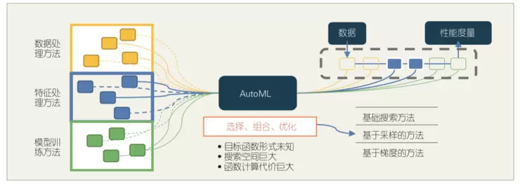 自动机器学习的研究核心是如何更好地对数据处理方法、特征处理方法、模型训练方法等基础部件进行选择、组合以及优化,以使学习到的模型的期望性能达到最优(见图 1)。