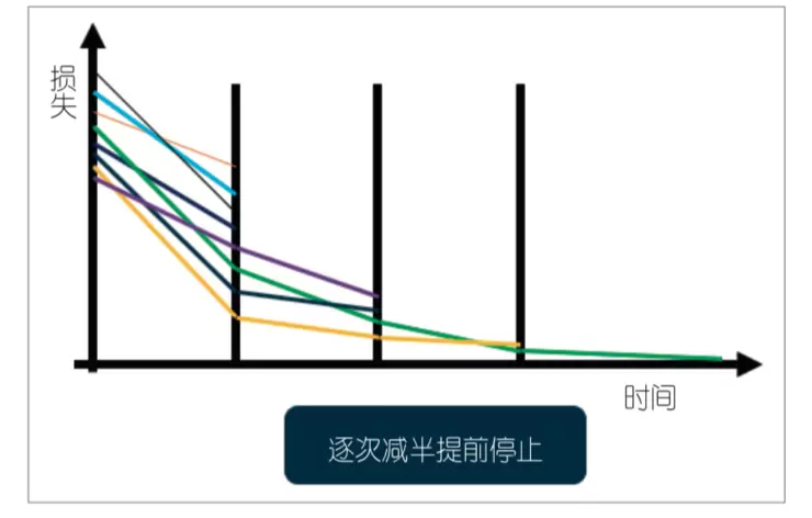 (3) 提前停止迭代,在训练早期就剔除一些表现不太好的参数,节省计算资源,比如最经典的逐次减半策略,每过一段时间都剔除其中一半不好的参数,极大地节省了计算资源(见图 3)。