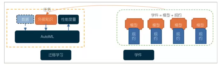 1. 效率提升。效率可从时间复杂度和样本复杂度两方面考量。在给定的计算资源下,更高的效率在一定程度上决定了自动机器学习的可行性,意味着可以进行更多探索,还可能会带来更好的效果。另外,获取高质量有标记的样本往往是非常昂贵的,因此样本复杂度也是影响机器学习落地的关键因素之一。在外部知识辅助的自动机器学习中引入学件 (学件 = 模型 + 模型的规约),利用迁移学习,是未来有效降低样本复杂度的可能方向 (见图 5)。