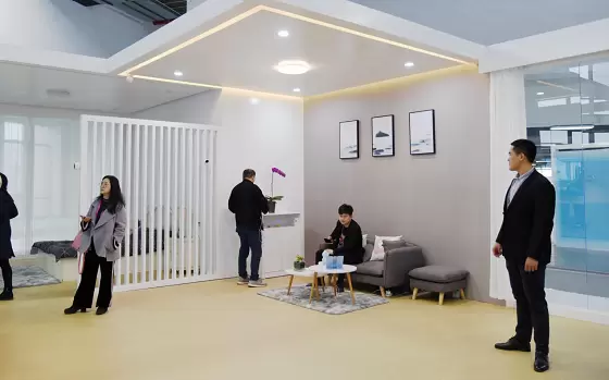 在现场展示的入户场景中,指纹锁开门触发回家模式,联动客厅灯光亮起,窗帘自动关闭,营造个人隐蔽空间。卧室场景,可使用萤石场景开关面板控制睡眠、起床、阅读等场景的灯光组合模式,睡眠模式下,红外感应器感应到下床动作时联动卫生间灯光亮起。