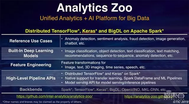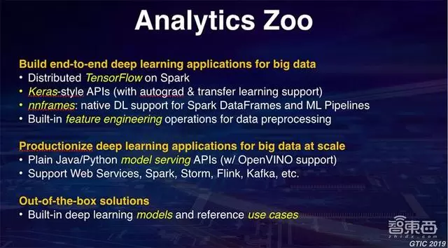 在这个上面,对很多用户来说,一个关键的痛点或者需求也好是如何能快速地从数据出发,最终将人工智能+大数据分析应用构建出来。在这个基础之上,去年我们开源了Analytics Zoo,这是我们基于Apache Spark上统一的大数据分析+人工智能平台。它能够无缝将TensorFlow、BigDL等一些深度学习的框架无缝地集成到端到端的大数据处理的一个工作流当中。