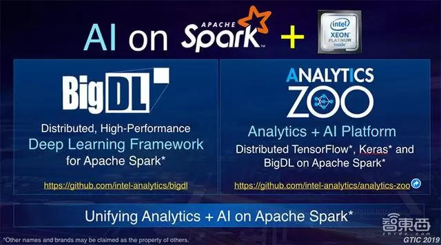 在这个前提下面,我们如何在像至强这样的一个基础的人工智能、大数据分析基础的计算平台上面,利用Apache Spark等为代表的大数据分析框架在平台上构建人工智能的能力呢?在这里,我们在英特尔做了几件事情。