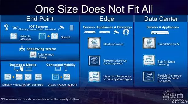 在英特尔我们一直致力于提供从端到端,包括设备端、边缘、网络到数据中心的一个端到端完整的解决方案或者计算架构,比如像Movidius、我们的至强处理器、NNP这样的神经网络处理器,构成了端到端的一个完整计算架构。其中我特别要提到,今天我们的至强服务器作为通用处理器仍然是大数据分析和人工智能的一个基础架构,它包括了Cascade Lake、下一代的至强可扩展处理器、以及支持一些新的功能,包括了像傲腾这样的数据中心级的持久内存,它们构成了一个非常基础的、应用非常广泛的大数据的人工智能+大数据分析的技术平台。