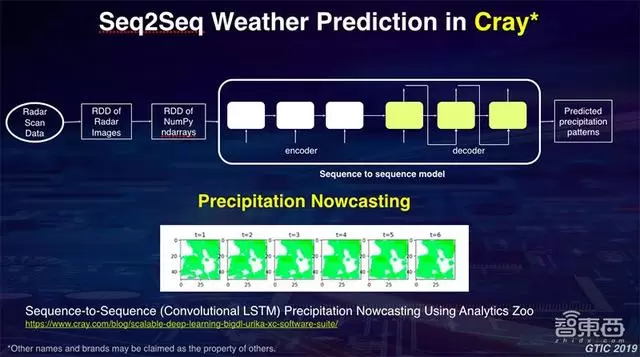 下面还有更多的例子,时间关系不具体讲了。这是我们跟世界银行的合作,在AWS上面做的一些对世界银行在各地拍摄的图片进行分类和统计的工作,以及我们和Cray公司,通过Seq2Seq模型,把过去一小时的卫星云图做一个序列,输入到模型里面,从而对天气进行短期预测。