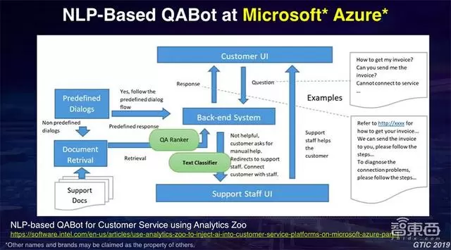 后面还有一些例子,比如说像我们跟Microsoft Azure的合作,如何使用基于NLP的自然语言处理技术,对其客服系统进行优化。通过NLP界面,包括对文本进行分类,或者对问题和回答进行匹配,来提高客服机器人回答问题的能力。