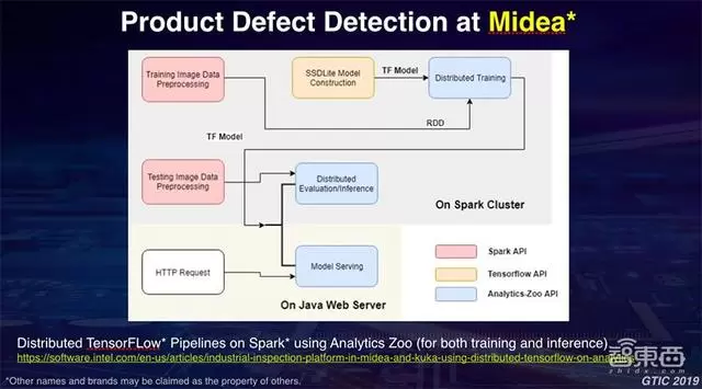 让我们看一下实际的案例,看一下如何应用Analytics Zoo平台。这是我们和美的的一个合作,美的是一个非常大的电器生产商,它们利用工业机器人做非常多的工作。我们跟美的的合作方式是,使用英特尔的至强服务器、边缘设备构建一个对美的工业机器人生产流水线上的产品进行自动检测的系统。