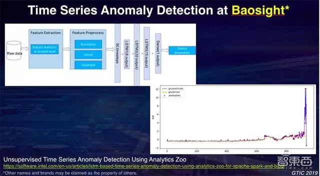 另外一个例子是我们和宝信的一个合作,大家知道宝信是一个非常大的制造商,因此他们有很多的设备,我需要对这个设备进行维护或者要预测它是不是会有问题。这里我们收集的数据是设备的一些震动频率的数据,从某种意义上是一个时间序列数据,在每一个时间点上收集到它的振动频率,我希望通过一些无监督的方式,在时间序列上能够自动检测出这个设备是否快要出问题,技术细节我不展开了。在时间序列上构建起一个相应模型,到最后的训练,我们通过Apache Spark能够很好地对其震动曲线同时进行报警。