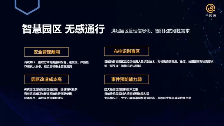 千视通与其他AI公司有所不同。现在业内头部的AI公司大多都聚焦于单点人脸识别和Re-ID技术,我们除了深耕这两项技术外,目前也在把这两项进行融合,实现“无感”,业务逻辑是把人与场景融合在一起,打造“无感园区”。