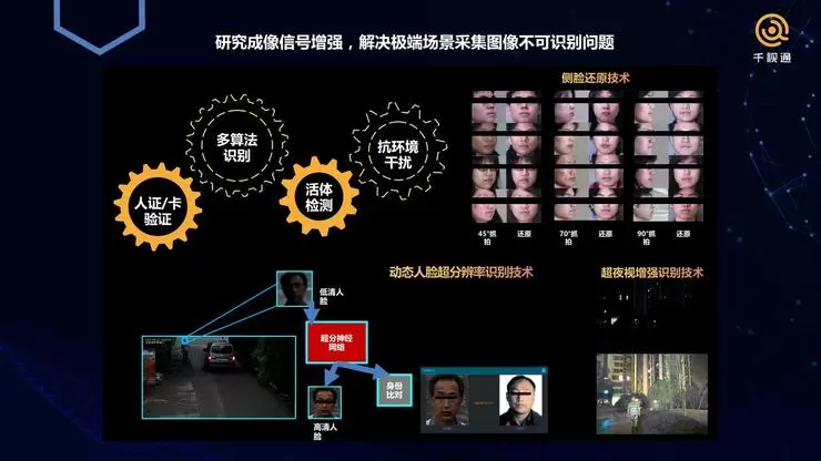 当然了,由于整个采集流程是无感的,所以采集的图像有时候质量不一定非常好,这时候需要我们用非常复杂的算法进行图像增强,比如通过超分辨率识别技术实现低清人脸的识别,从而进行高清人脸以及进行身份比对。