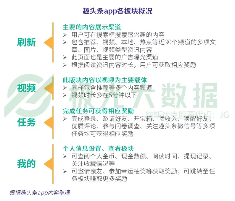 趣头条app板块设置可主要分为:资讯阅读、拉新拉活两个部分。“刷新”功能通过个性化推荐、热点、本地资讯等为用户提供多样化丰富内容;“视频”功能主打多样化的视频内容;“任务”、“我的”两部分则通过多种活动鼓励用户推荐新用户、唤醒沉睡用户、阅读资讯、发布优质评论。