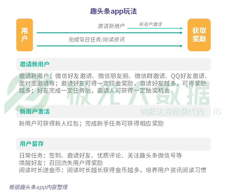 趣头条app用户获得金币奖励的主要方法有两种,一是邀请新用户,二是完成每日任务/阅读资讯。邀请者可获得相应奖励,被邀请者可获得新人红包,完成新手任务也可获得奖励;利用奖励引导用户完成每日任务/阅读资讯,可提升用户留存,培养用户资讯阅读习惯。