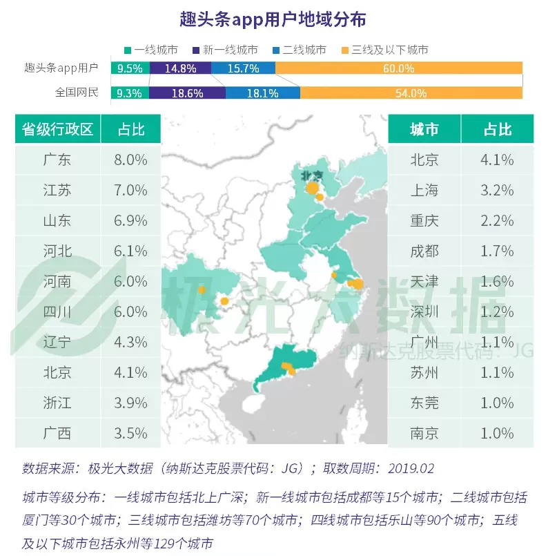 根据极光大数据的统计结果,6成趣头条app户位于三线及以下城市;广东、江苏、山东的趣头条用户占比最高。