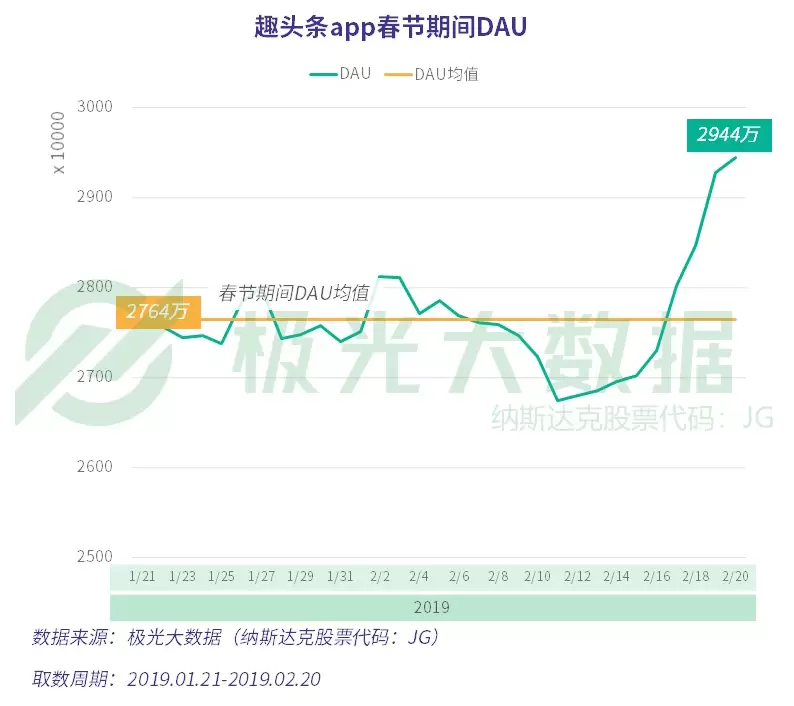根据极光大数据的统计结果,2019年春节期间,趣头条app日活跃用户均值为2764万。春节后,趣头条app日活跃用户规模明显提升,2019年2月20日,趣头条app DAU升至2944万。
