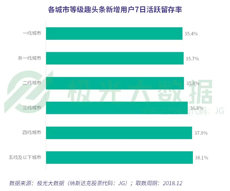 根据极光大数据的统计结果,2018年12月,趣头条四线及以下城市用户7日活跃留存率均在38%左右,略高于三线及以上城市用户,各城市等级新增用户7日活跃留存率均在35%以上,在行业中排名靠前。