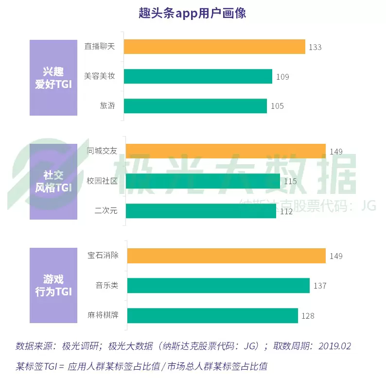根据极光大数据的统计结果,趣头条app用户社交属性较强,爱直播聊天、爱同城社交、爱玩游戏,并偏好宝石消除、音乐、麻将棋牌类游戏。
