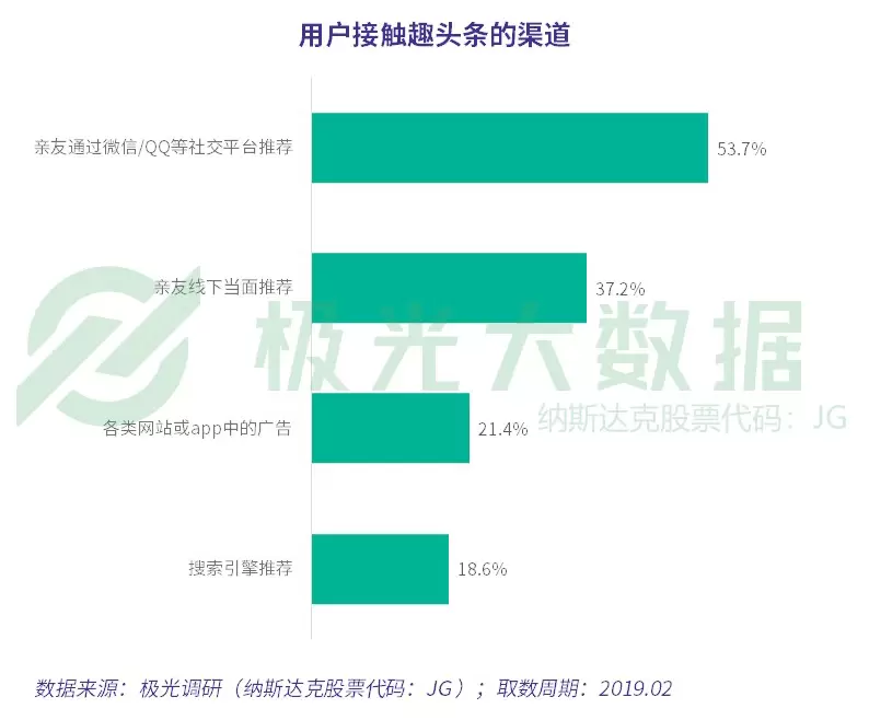 根据极光大数据的调研结果,社交平台推荐为用户知道趣头条的主要渠道。半数趣头条用户通过亲友在社交平台推荐知道趣头条,亲友线下推荐也是重要原因,占比达37.2%。