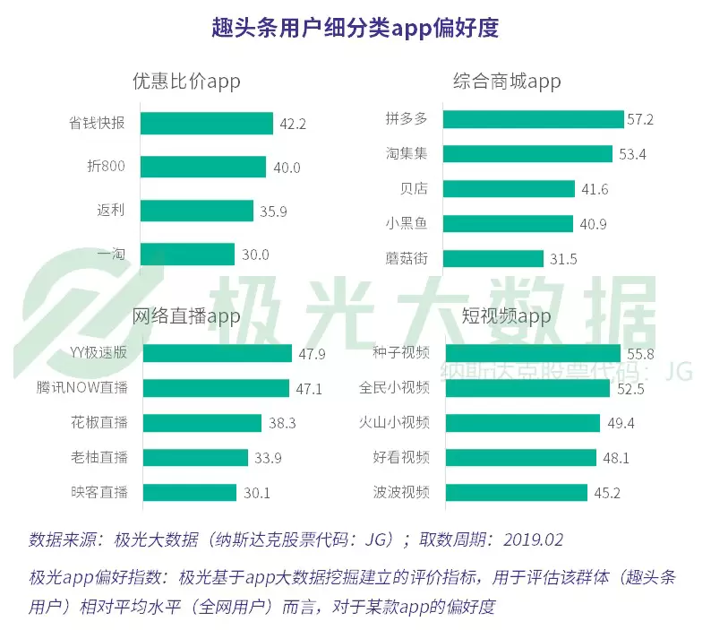 根据极光大数据的统计结果,优惠比价类app中,趣头条用户最为偏好省钱快报,其次为折800;综合商城类app中,趣头条用户最为偏好拼多多。趣头条用户最为偏好的网络直播app为YY极速版,也偏好好看视频等短视频app。