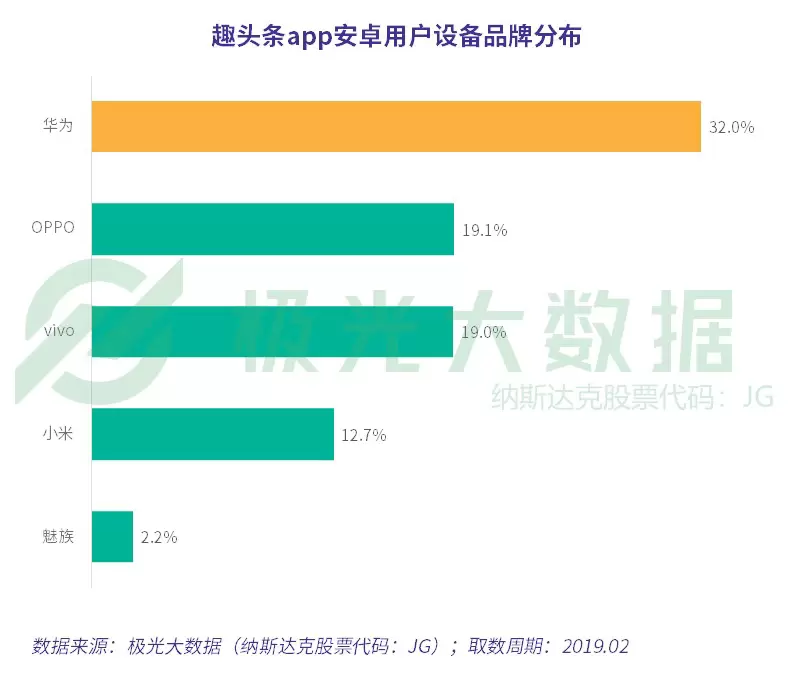 根据极光大数据的统计结果,趣头条安卓用户中,华为用户最多,占比超过3成,OPPO、vivo、小米用户占比也均在10%以上。
