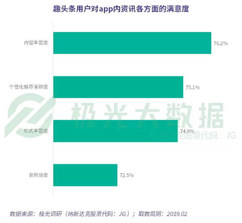 根据极光大数据的调研结果,用户对趣头条app内资讯各方面满意度均在70%以上,76.2%的用户表示满意其内容丰富程度,个性化推荐准确度较高,拥有文字、图片、视频等多种资讯形式也获得用户认可。