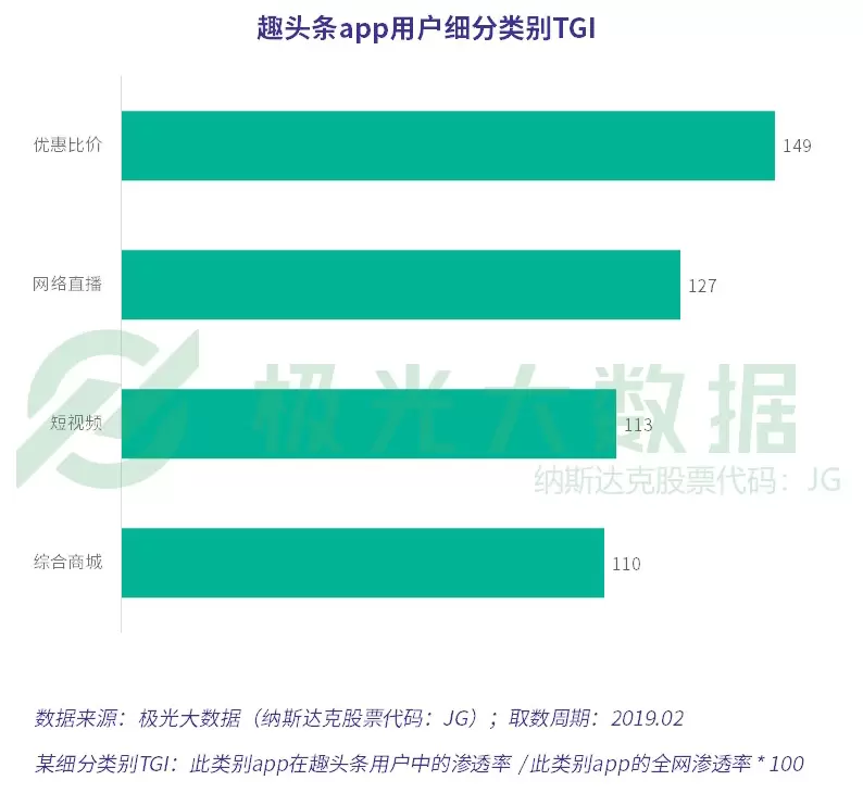 根据极光大数据的统计结果,相比全网平均水平,趣头条用户安装优惠比价、综合商城类购物app和网络直播、短视频类娱乐app的比例更高。