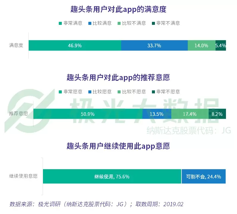 根据极光大数据的调研结果,趣头条用户对此app的满意度和推荐度均比较高,约8成用户表示对其满意,超6成愿意推荐,愿意继续使用此app的用户占比也达到了7成以上。