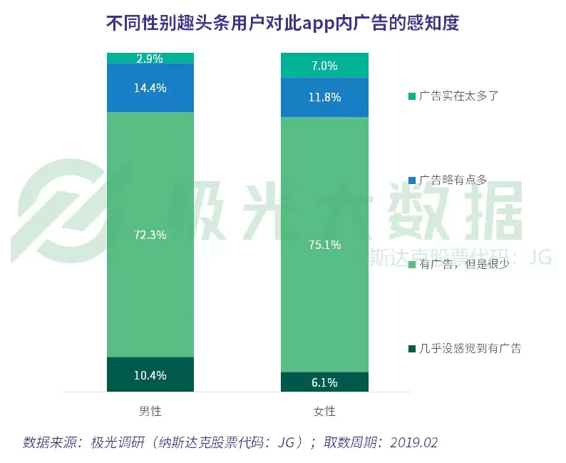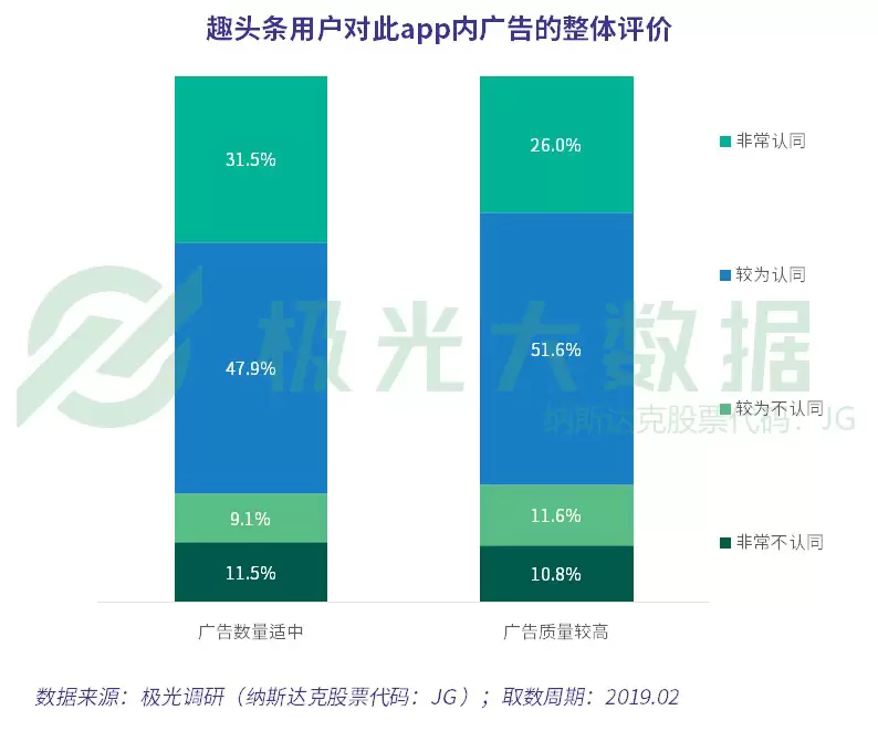 根据极光大数据的调研结果,约8成趣头条用户认为趣头条app内广告数量适中或广告质量较高,体现出用户对于此app内广告较为包容和认可。