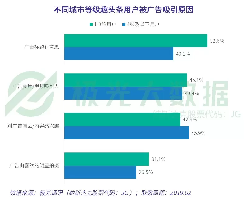 根据极光大数据的调研结果,45.9%的4线及以下用户会因对广告商品/内容感兴趣而点击广告,1-3线用户则更易被标题吸引;广告明星对于1-3线用户的吸引力也略高于4线及以下用户。