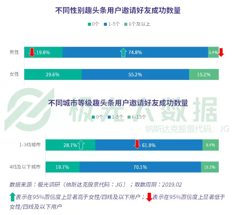 根据极光大数据的调研结果,4线及以下用户更爱邀请好友,7成4线及以下用户邀请好友数量在1-5个;邀请好友在6人及以上的女性用户占比比男性高,超1成女性用户邀请成功过6个及以上好友,男性邀请好友数量则较为集中于1-5个。