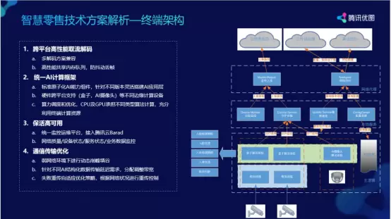 在零售方案中,由于线下门店遍布全国,设备以及服务的可靠性也是至关重要的。腾讯优图在终端上设计了分层架构,无论前端设备是什么,其接入取流是独立的一层。把AI 相关的处理包括检测、跟踪、优选以及轨迹处理放于算法层。在算法层之上是服务监控层,监控包括设备的监控、服务的监控。在设备层监控服务基础之上是网络监控层,通过分离架构的设计兼容多个终端设备,保证服务的可靠性。