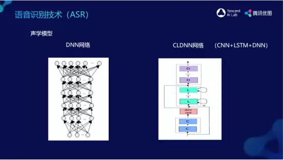 最为常见的声学模型网络包括DNN 网络以及 CLDNN 网络。其中,基础的 DNN 网络,下层为输入层,中间包含若干隐层,上层为输出层。而较为通用的 CLDNN 网络,C 就是卷积网络,L 是 LSTM 网络,D 就是 DNN,其特点为快速收敛,可快速达成较好的识别效果。