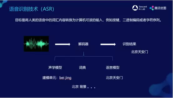 其中,语音识别技术是把人类语音中的词汇内容转换成计算机可读的输入,简单来说就是把语音转为文本。当音频信号产生后,被传输至云端,也就是解码器。而解码器中的声学模型会把音频信号转化成建模单元,建模单元通常为拼音,之后接入词典,通过词典把拼音转化为文本,把发音相近的字或词挑选出来;语言模型部分,把最有可以的字或词按照时序组合出来,显示为识别结果文本。