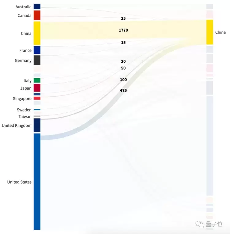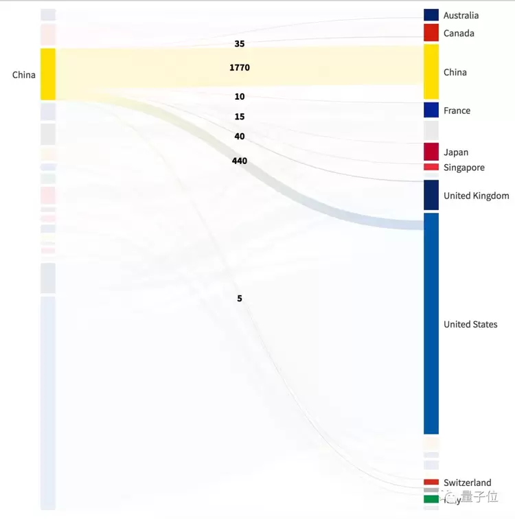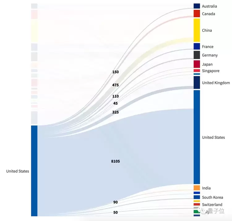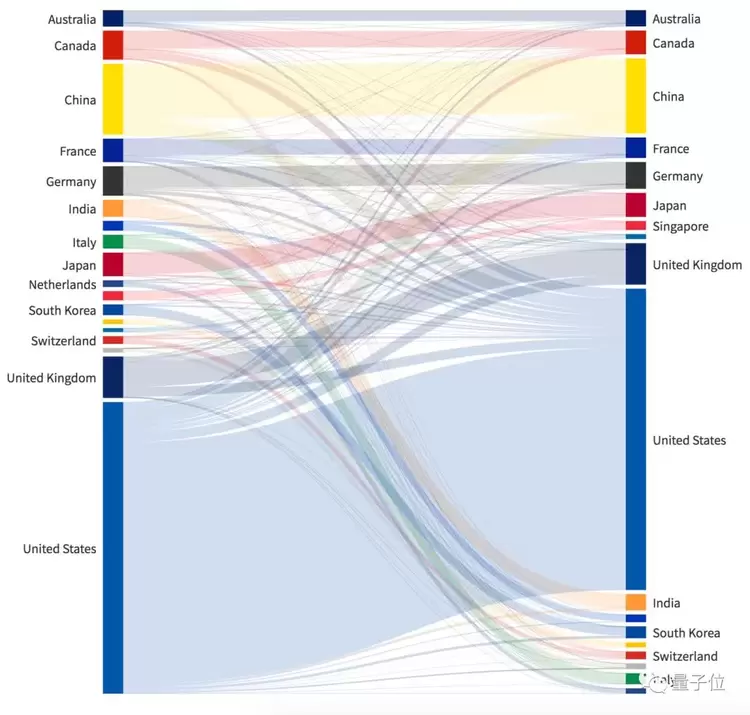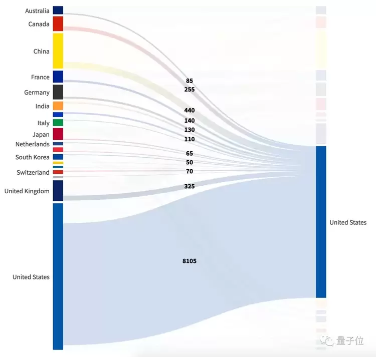 上面这个图中,左侧是人才们读博的国家,右侧是他们工作的国家,中间连接线的粗细,意味着在这里读博、去哪里工作的人数多少。