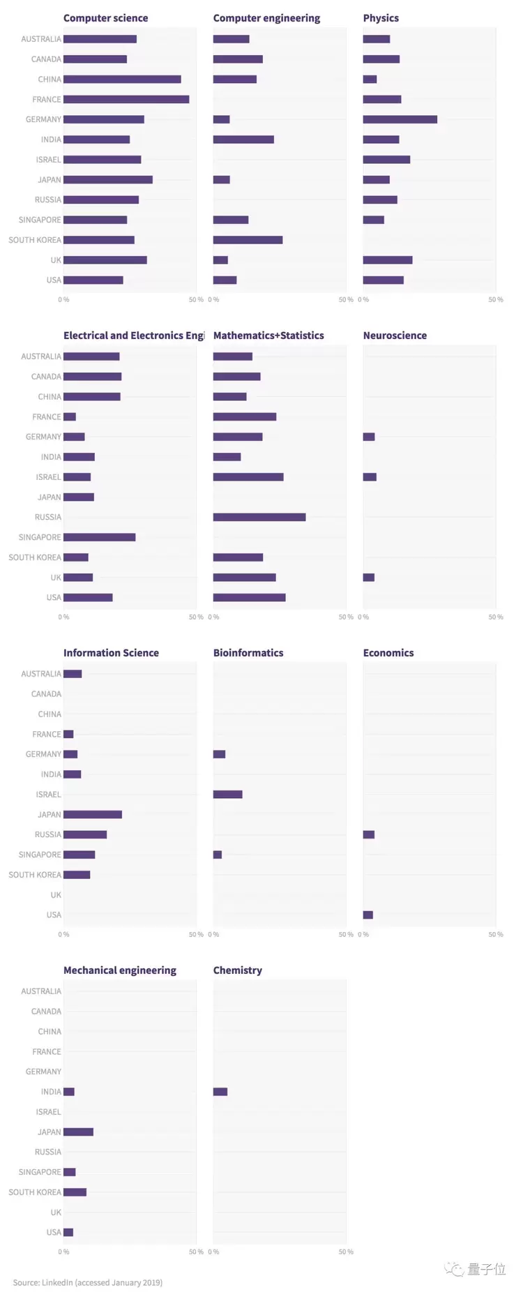下面的统计图,就是各国AI顶尖人才出身于哪个专业的数据。