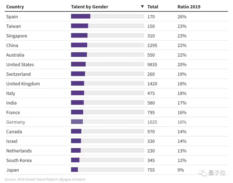西班牙、新加坡、中国和澳大利亚是AI圈子里女性最多的地方,均超过了20%;日本则是女性最少的地方,顶尖AI人才中只有不到十分之一是女性。