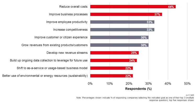 但是,在很多情况下,进行物联网部署的驱动力是一致的:企业正在寻求降低成本,以及更高的效率和生产力。约三分之一的受访者也非常重视使用物联网来提高竞争力或客户体验。即使在制造业这样的传统B2B领域,这也是许多企业的关键物联网目标,来自物联网的可持续性和新收入增长也很受关注,虽然对于多数企业来说实现这些还为时尚早。