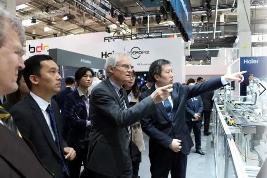 图注:德国工业4.0之父、德国工程院董事会主席孔翰宁(左三)与德国工程院院士、弗劳恩霍夫光伏研究院院长Eicke R.Weber(左一)参观体验海尔展区
