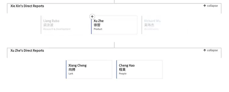 Lark 所在的效率工程部门负责人是公司高级副总裁谢欣,曾是百度核心软件工程师,也曾担任旅游搜索引擎酷讯旅游 CTO,于 2015 年加入字节跳动。在脉脉上 tittle 为高级产品总监的徐哲是 Lark 产品的实际负责人,与他搭配的产品研发部门的负责人是今日头条技术总监梁汝波,包括商业化变现(monetization)负责人吴玮杰在内的三人都向谢欣汇报工作。