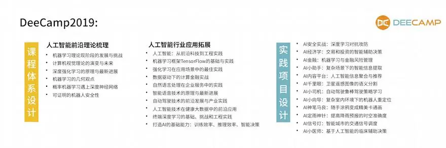 据悉,DeeCamp 2019 将引入中国AI学术最强两位学术大咖作为科学总顾问,同时有数十家知名AI企业参与,将于7月15日至8月23日在北京、上海、南京、广州四地同时举办。