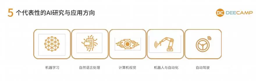 DeeCamp 2019人工智能训练营的学术与产业课程设计将围绕全球最热的5个AI研究方向展开。这5个研究方向包括:机器学习、自然语言处理、计算机视觉、机器人与自动化、自动驾驶。
