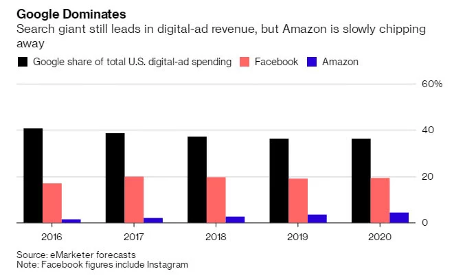谷歌的统治地位。该搜索巨头的数字广告收入仍然处于领先地位,但亚马逊正在慢慢侵蚀其市场份额。