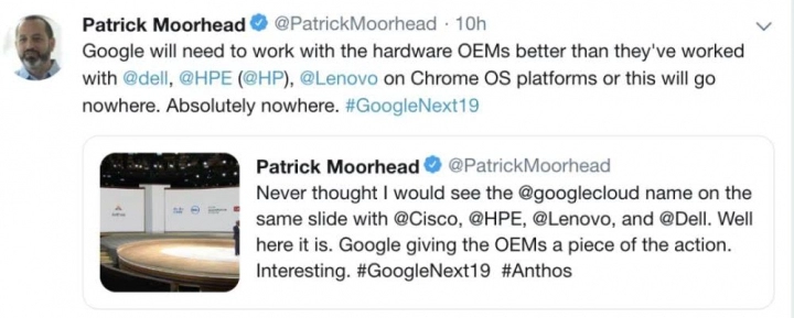 Moor Insights&Strategy总裁兼首席分析师Patrick Moorhead也在推特上感慨道,从未想过能看谷歌云的名字和思科、惠普、联想、戴尔出现在同一张PPT上。